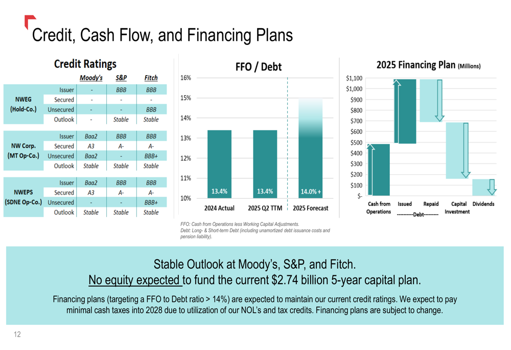 The company maintains stable credit ratings with a Funds From Operations (FFO) to Debt ratio of 13.4% for the trailing twelve months ended Q2 2025, with a forecast to exceed 14% for the full year 2025. Management emphasized that no equity issuance is expected to fund the current $2.74 billion five-year capital plan.