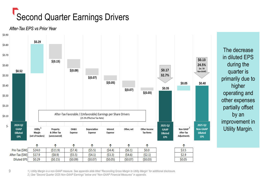 The earnings decline was primarily driven by higher operating and other expenses, partially offset by improved utility margin. The company’s waterfall chart illustrates how various factors contributed to the EPS decrease: