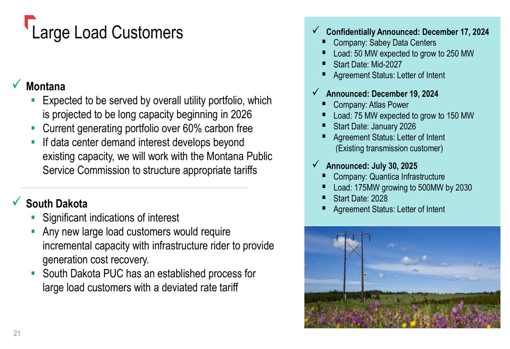 NorthWestern continues to focus on data center opportunities as a key growth driver. The company announced its third Letter of Intent with a 500+ megawatt data center developer, adding to previously announced agreements with Sabey Data Centers (250 MW) and Atlas Power (150 MW).