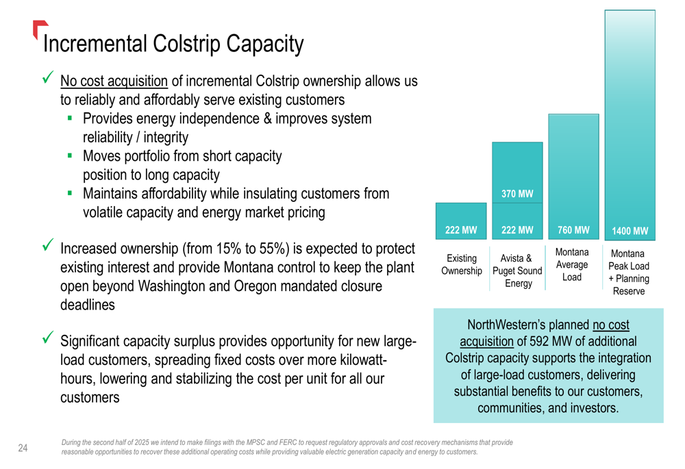 Another strategic initiative involves the company’s increased ownership in Colstrip from 15% to 55%, providing significant capacity surplus to support new large-load customers: