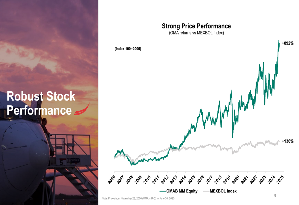 OMA’s stock has significantly outperformed the Mexican market, delivering an 892% return since its IPO in November 2006, compared to 136% for the MEXBOL Index: