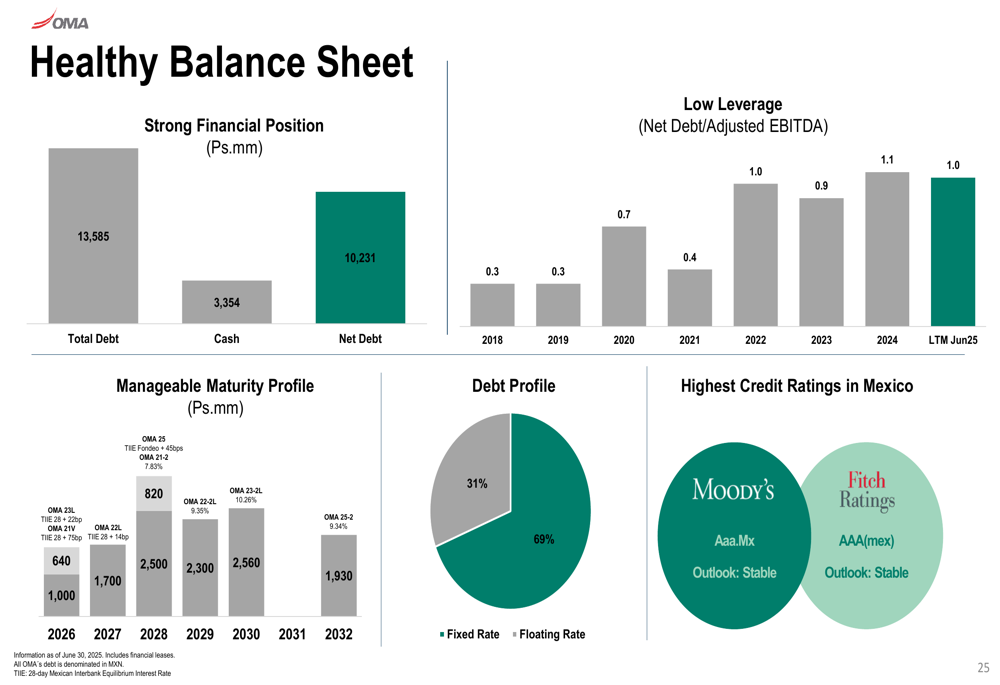 Mexico’s air travel market remains underpenetrated at 0.5 flights per capita compared to 2.8 in the United States, presenting significant growth opportunities. Favorable demographics with a growing middle class further support the long-term growth outlook for Mexican airports.