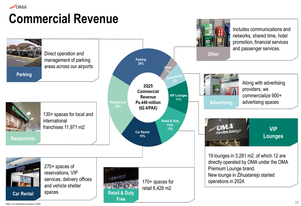 OMA’s commercial revenue is well-diversified across multiple categories, with parking (28%), restaurants (20%), and car rentals (15%) representing the largest segments. The company operates over 24,659 square meters of commercial space across its 13 airports, maintaining high occupancy levels and incorporating innovative advertising and premium offerings.