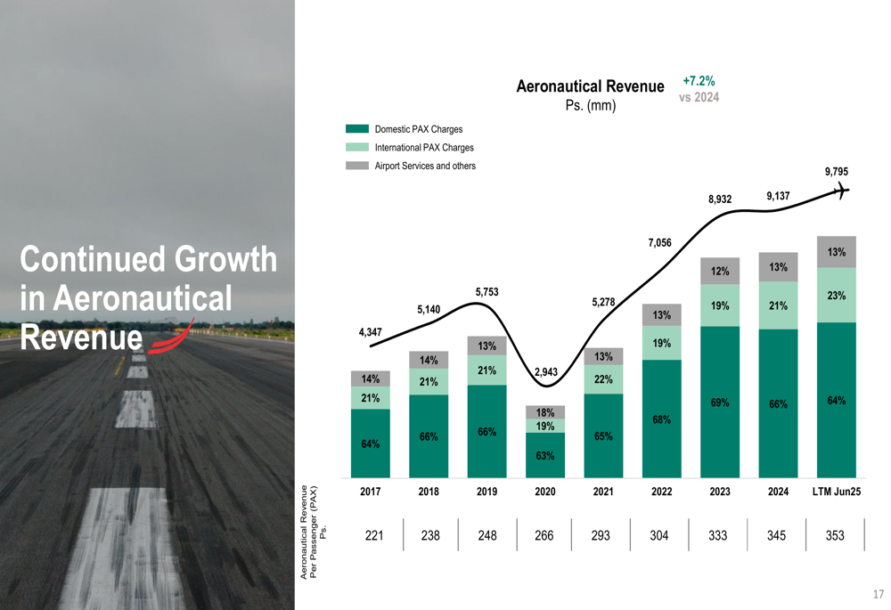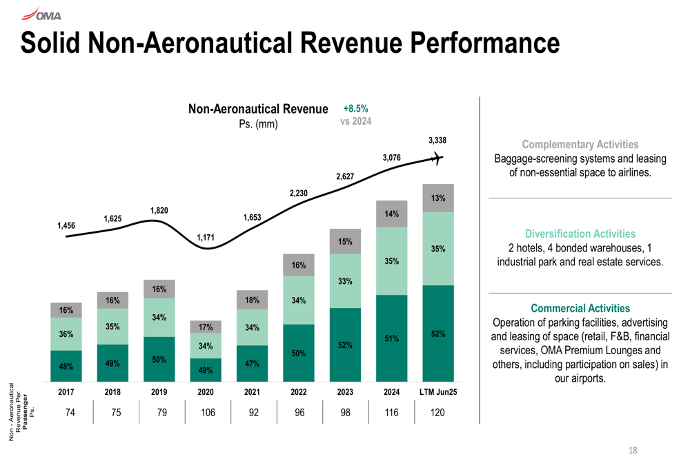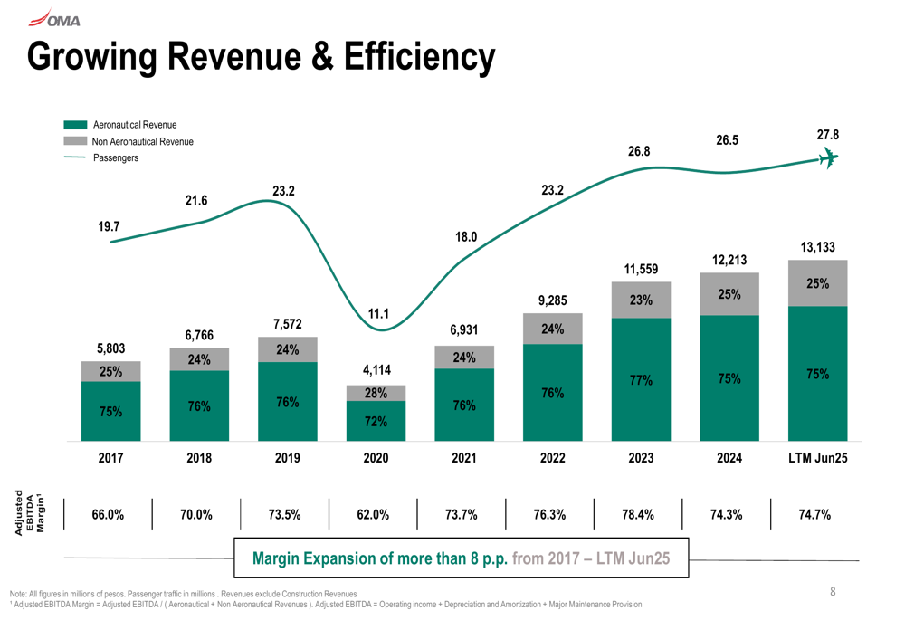 OMA’s financial results demonstrate consistent growth and margin expansion over recent years. Aeronautical revenue increased from 4,347 million pesos in 2017 to 9,795 million pesos in the last twelve months ending June 2025, while non-aeronautical revenue grew from 1,456 million pesos to 3,338 million pesos over the same period.
