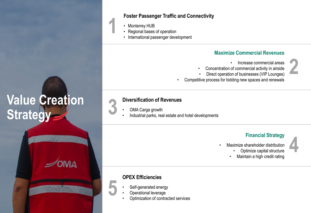 OMA’s value creation strategy focuses on fostering passenger traffic and connectivity, maximizing commercial revenues, diversifying revenue streams, optimizing capital structure, and improving operational efficiencies: