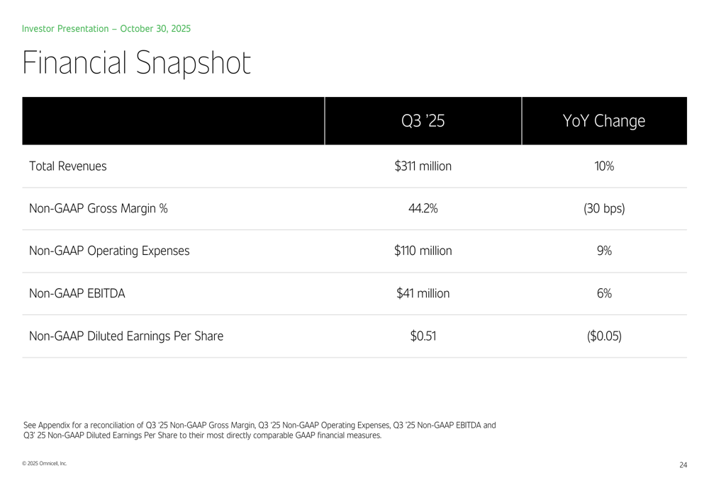 Omnicell’s Q3 2025 financial results demonstrated solid growth across key metrics. The company reported total revenues of $311 million, representing a 10% increase year-over-year. Non-GAAP EBITDA grew to $41 million, up 6% compared to the same period in 2024, while Non-GAAP earnings per share came in at $0.51, slightly down from $0.56 in the prior year.