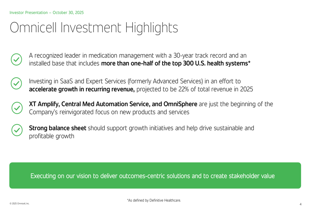 Investment highlights from the presentation underscore why Omnicell believes it is well-positioned for future success: