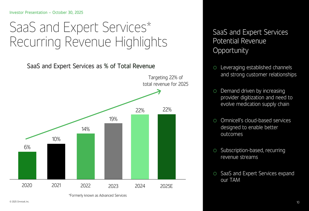 Omnicell’s investor presentation highlighted several key strategic initiatives designed to drive long-term growth. Central to this strategy is the company’s focus on expanding its SaaS and Expert Services offerings, which are projected to reach 22% of total revenue by 2025, up significantly from just 6% in 2020.