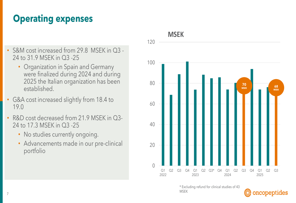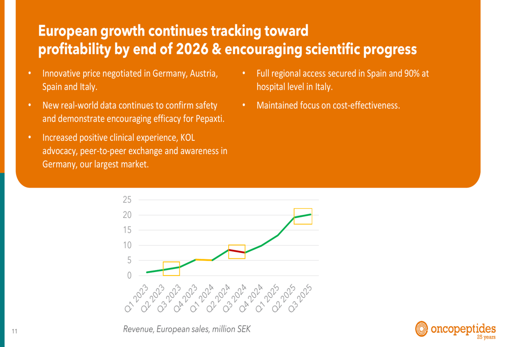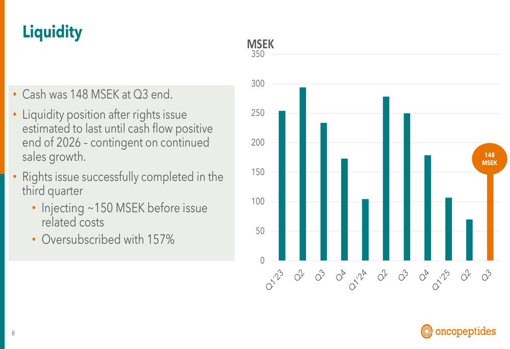 Oncopeptides ended Q3 with a cash position of SEK 147.9 million, bolstered by a successful rights issue that was oversubscribed to approximately 157%. This capital infusion is expected to provide runway until the company reaches cash flow positivity, targeted for the end of 2026.