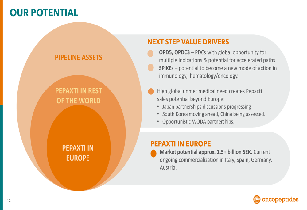 Beyond Pepaxti, Oncopeptides is developing next-generation Peptide-Drug Conjugates (PDCs) and NK cell engagers through its SPIKE platform, targeting applications in multiple myeloma and potentially other indications including solid tumors and autoimmune diseases.