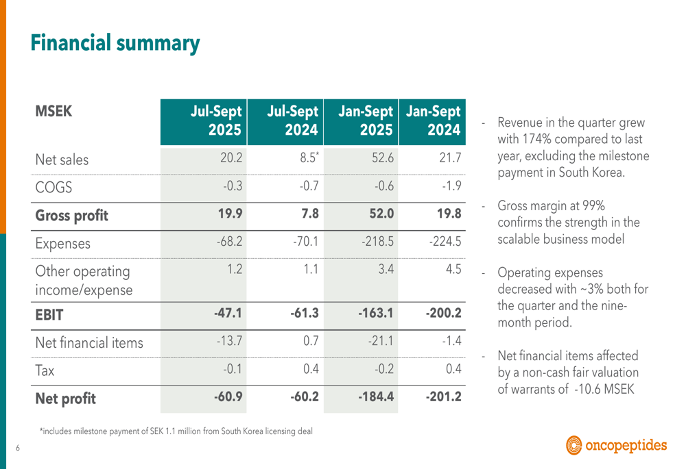Oncopeptides reported net sales of SEK 20.2 million in Q3 2025, representing a 174% increase compared to SEK 7.4 million in Q3 2024. The company maintained an impressive 99% gross margin, demonstrating the strength of its scalable business model.