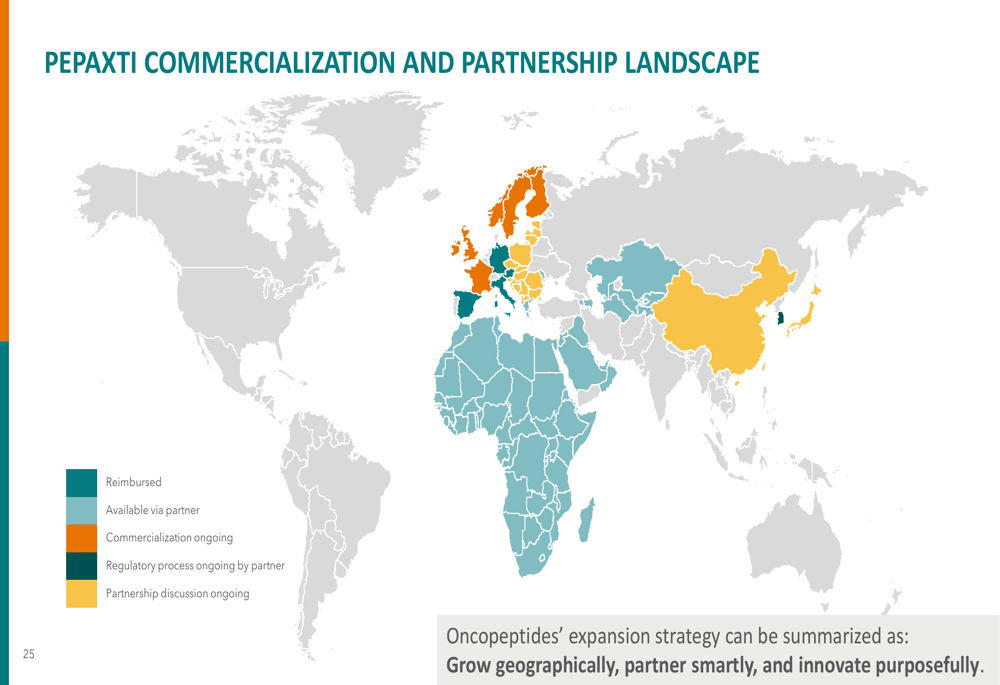 The global commercialization and partnership landscape shows Oncopeptides' current market presence and expansion targets:
