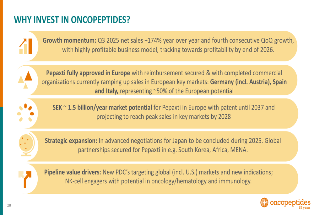 Oncopeptides estimates the European market potential for Pepaxti at approximately SEK 1.5 billion annually, with patent protection extending to 2037. The company projects reaching peak sales in key European markets by 2028 and achieving profitability by the end of 2026, contingent on continued sales growth.