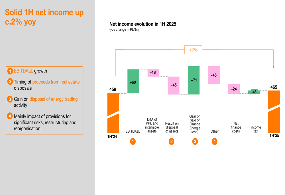 Net income for the first half of 2025 reached PLN 465 million, representing a 1.5% increase year-over-year. This modest growth reflects the positive impact of EBITDAaL growth and the gain from the Orange Energia sale, offset by higher depreciation and amortization expenses, lower gains from asset disposals, and increased net finance costs.