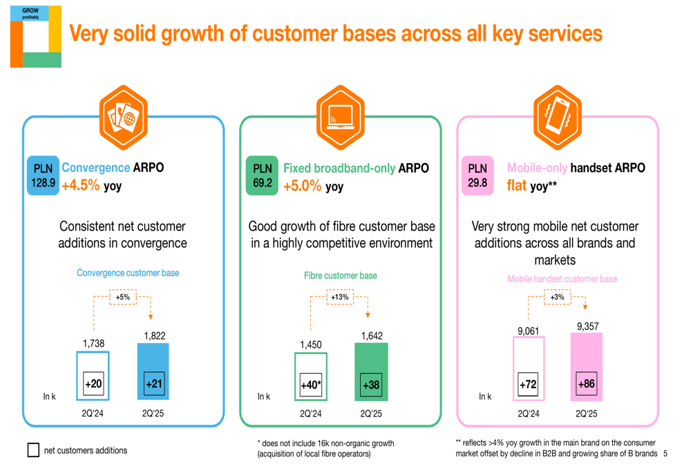 Orange Polska reported customer growth across all key service categories, demonstrating its ability to attract and retain subscribers in a competitive market environment. The convergence customer base grew to 1,822,000, adding 21,000 customers in Q2 and 84,000 year-over-year. The fixed broadband-only segment expanded to 1,642,000 customers, including 16,000 non-organic growth, while mobile-only handset subscribers increased to 9,357,000.
