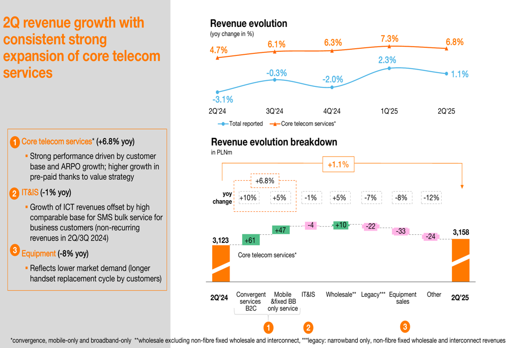 Orange Polska delivered strong financial performance in Q2 2025, with notable improvements across all key metrics. Revenue increased by 1.1% year-over-year to PLN 3,158 million, while EBITDAaL rose 4.3% to PLN 891 million, representing 28.2% of revenues (a 0.9 percentage point improvement). Net income showed the strongest growth at 18.6%, reaching PLN 274 million.