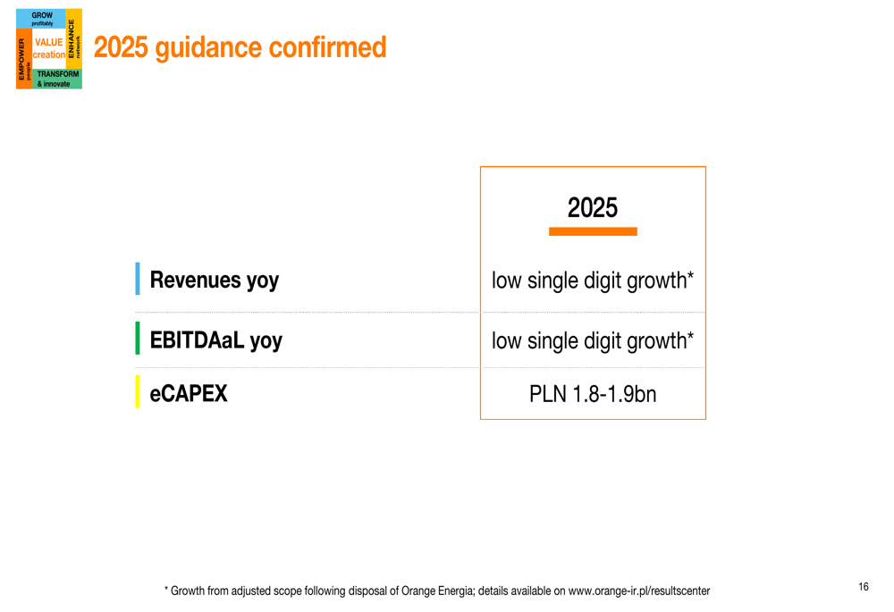 Orange Polska confirmed its full-year guidance for 2025, projecting low single-digit growth for both revenues and EBITDAaL, adjusted for the disposal of Orange Energia. The company expects capital expenditure to remain between PLN 1.8-1.9 billion for the year.
