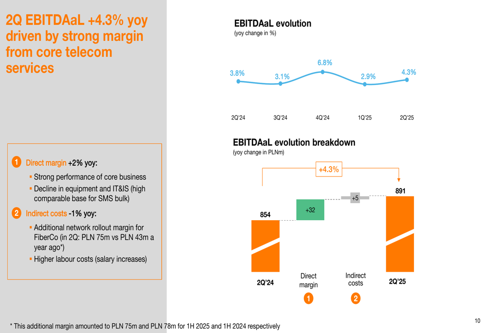 The company’s EBITDAaL growth of 4.3% in Q2 2025 was driven by strong margin performance in core telecom services. Direct margin increased by 2% year-over-year, while indirect costs decreased by 1%, benefiting from additional network rollout margin for FiberCo (PLN 75 million in Q2 2025 versus PLN 43 million a year ago), partially offset by higher labor costs due to salary increases.