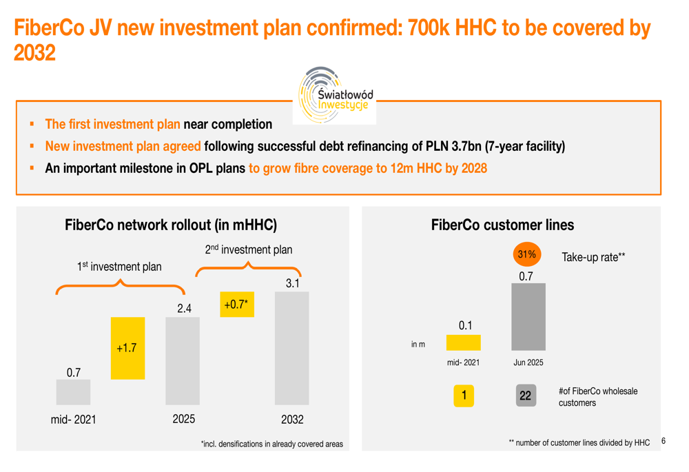 Orange Polska’s presentation highlighted several strategic initiatives aimed at strengthening its market position and supporting long-term growth. A key development is the new investment plan for FiberCo JV, which confirms an additional 700,000 households to be covered by 2032. This expansion follows successful debt refinancing of PLN 3.7 billion through a seven-year facility.