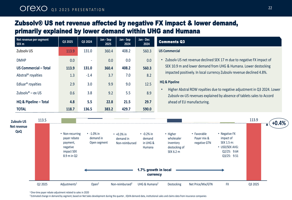 Zubsolv, Orexo’s primary revenue driver, experienced a 4.8% decline in local currency terms. The company attributed this partly to wholesaler inventory fluctuations, which they characterize as seasonal, with inventory build expected in Q4 following historic patterns.