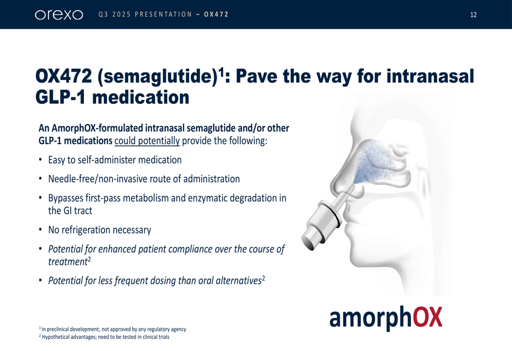 The company’s most notable advancement is in the application of AmorphOX technology to deliver GLP-1 receptor agonists nasally. Their OX472 program, focused on intranasal semaglutide formulation, shows potential advantages over existing products: