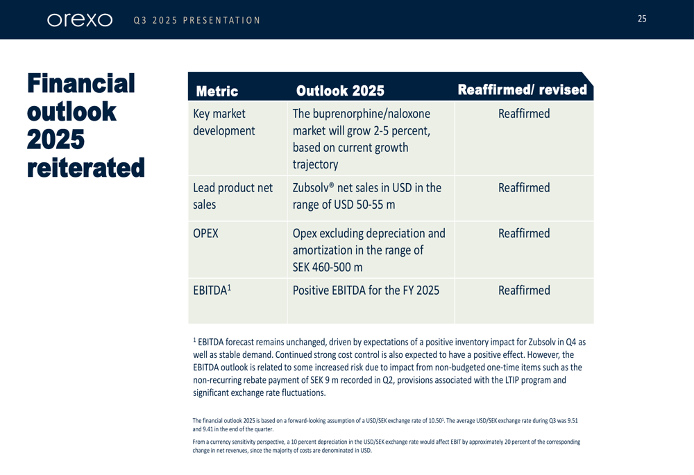 Despite current challenges, Orexo reiterated its financial outlook for 2025, maintaining guidance for positive EBITDA for the full year: