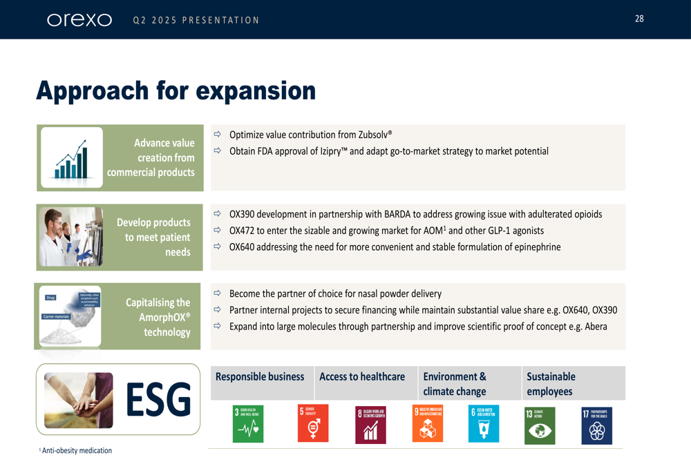 Orexo outlined its approach for expansion, focusing on four key areas: optimizing value from commercial products, developing products to meet patient needs, capitalizing on AmorphOX technology, and advancing ESG goals: