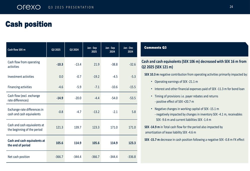 The cash position analysis shows a decrease of 16 million SEK during the quarter, with the company ending Q3 with 105.6 million SEK in cash and cash equivalents: