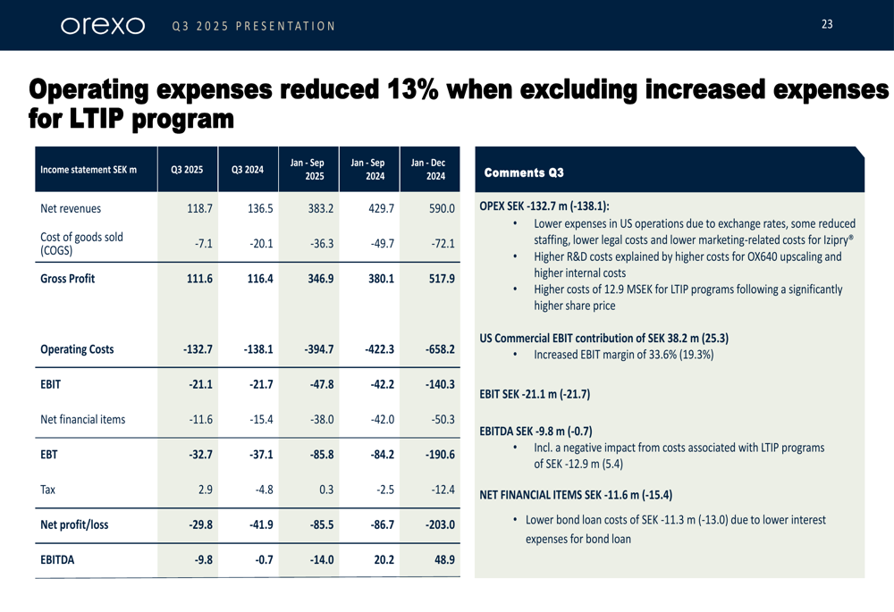 Orexo reported Q3 2025 net revenue of 119 million SEK, falling short of analyst expectations of 128.1 million SEK. The company posted a negative EBITDA of 9.8 million SEK, though management noted this figure would have been positive excluding long-term incentive program provisions.