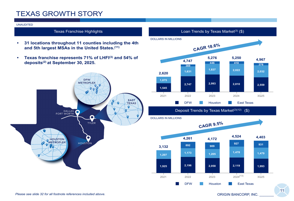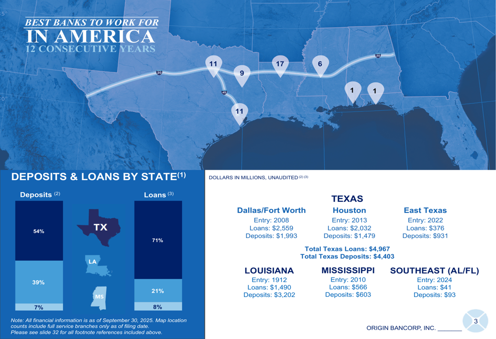 Origin Bancorp maintains a strategic focus on high-growth markets in the Southern United States, with particular emphasis on Texas, which represents 71% of loans and 54% of deposits. The company operates 31 locations across 11 Texas counties, highlighting the state's economic strength as the 8th largest economy globally and #1 in job creation nationally.