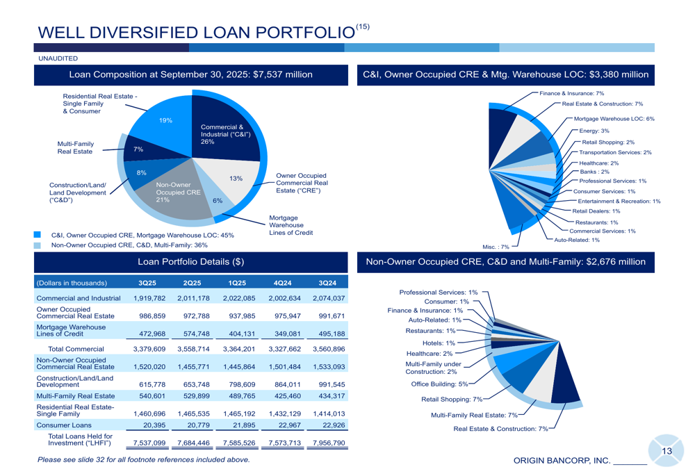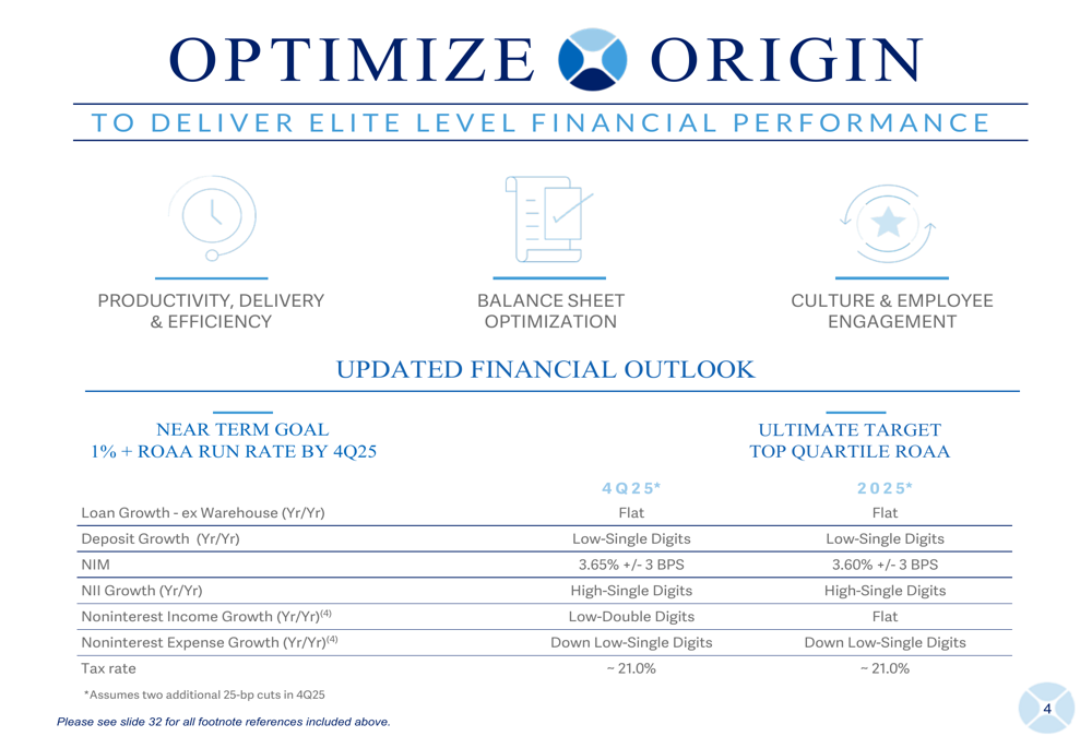 Origin Bancorp has updated its financial outlook, revising loan growth guidance for 2025 to flat, a significant shift from earlier growth expectations. The company anticipates modest 2% loan growth in Q4, with mid to high single-digit growth projected for 2026.
