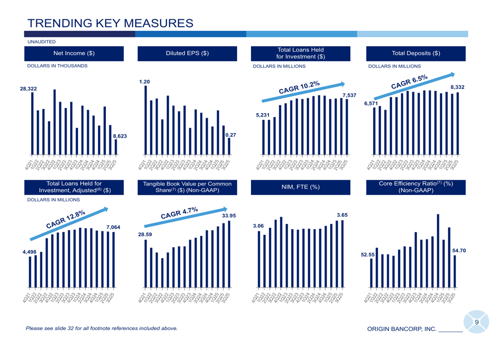 The company continues to build tangible book value, which reached $33.95 per share, marking the 12th consecutive quarter of growth in this important metric. This consistent growth demonstrates Origin's ability to generate and retain capital despite quarterly earnings volatility.