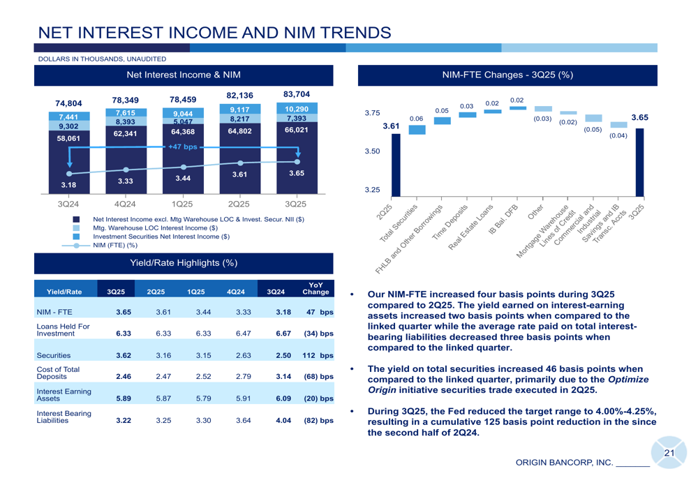 Origin Bancorp's third quarter 2025 results present a complex picture of a company navigating significant challenges while implementing strategic optimizations. The substantial EPS miss due to the fraud-related loan loss provision overshadowed improvements in net interest margin and deposit growth.