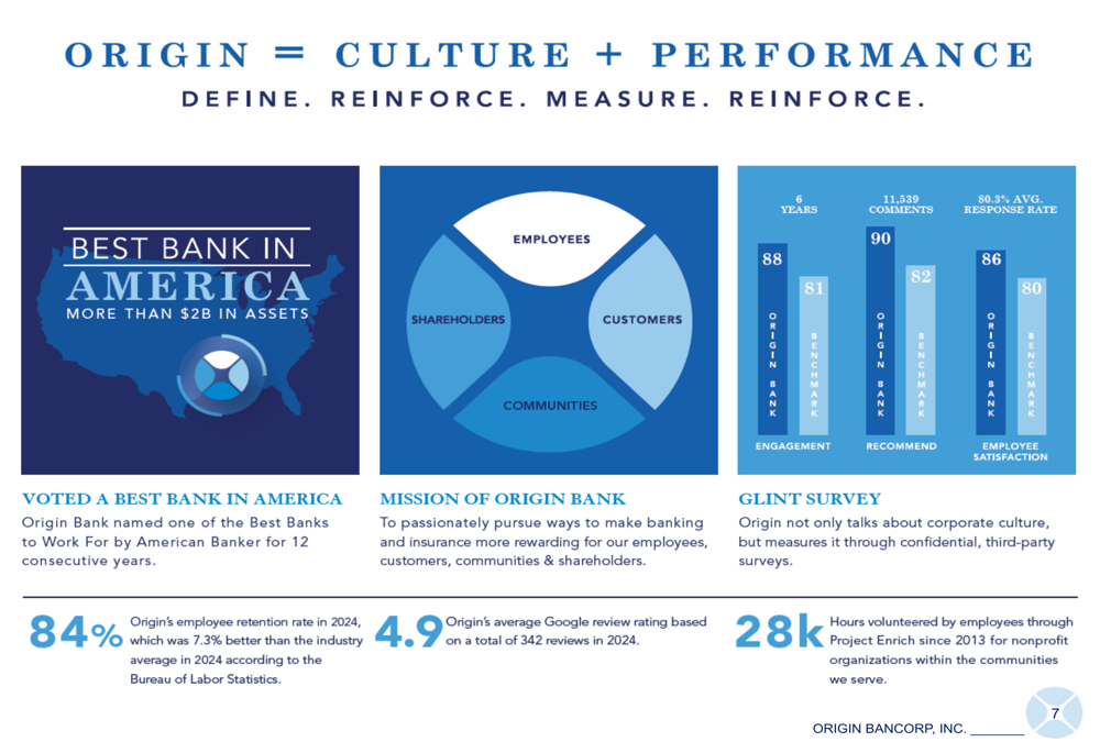 The company highlighted its strong corporate culture as a competitive advantage, with an 84% employee retention rate (7.3% above the industry average), a 4.9 average Google review rating, and recognition as one of the "Best Banks to Work For" by American Banker for 12 consecutive years.