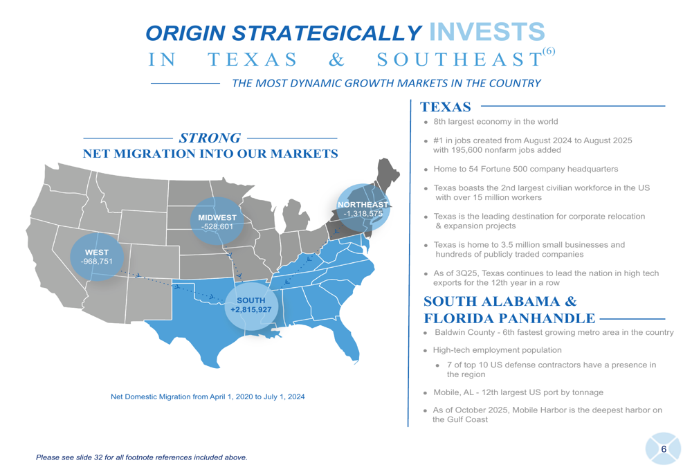 The Texas market continues to be central to Origin's growth strategy, with significant presence in Dallas-Fort Worth, Houston, and East Texas. The company views the state's robust economic fundamentals, including its position as home to 54 Fortune 500 headquarters and status as a leading destination for corporate relocation, as key drivers for future growth.