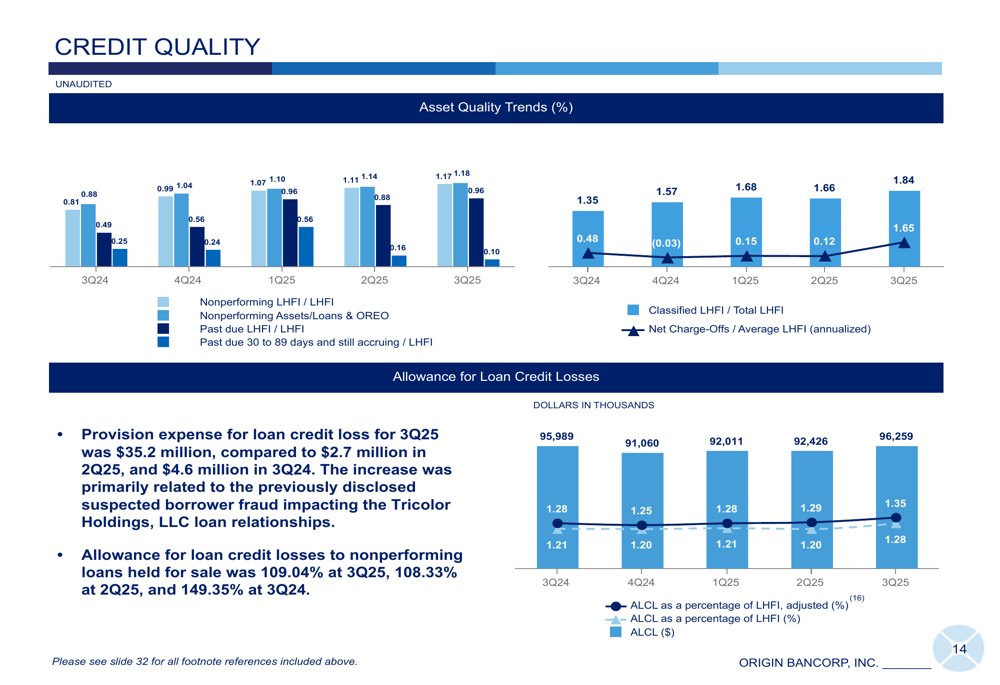 The most significant factor impacting Origin's third quarter results was a substantial increase in loan loss provisions. The company reported provision expense for loan credit losses of $35.2 million in Q3 2025, compared to just $2.7 million in the previous quarter and $4.6 million in the same quarter last year.