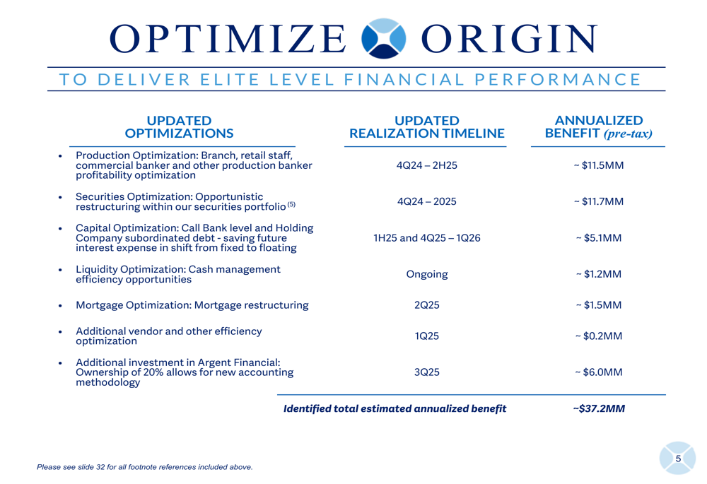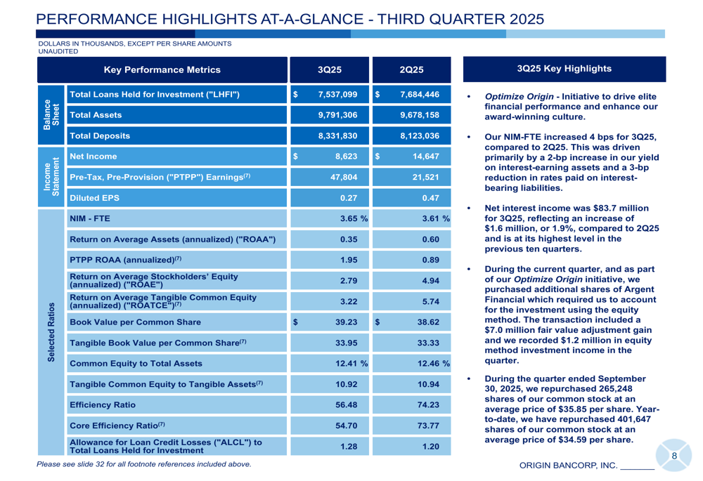 A central focus of Origin's investor presentation was its "Optimize Origin" initiative, which aims to deliver approximately $37.2 million in annualized pre-tax benefits through various optimization strategies. These include production optimization ($11.5 million), securities optimization ($11.7 million), capital optimization ($5.1 million), and additional investment in Argent Financial ($6.0 million).