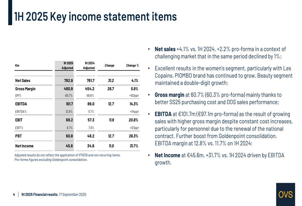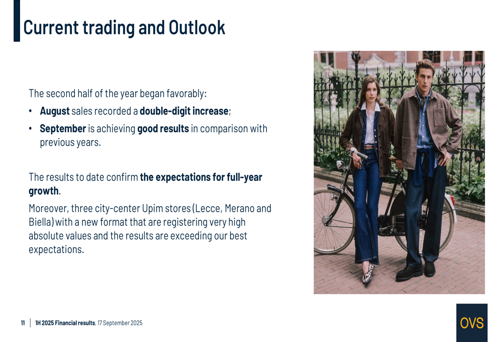 OVS reported a strong start to the second half of the year, with August sales recording a double-digit increase compared to 2024. The company also noted that September is achieving good results in comparison with previous years, reinforcing management’s confidence in meeting full-year growth expectations.