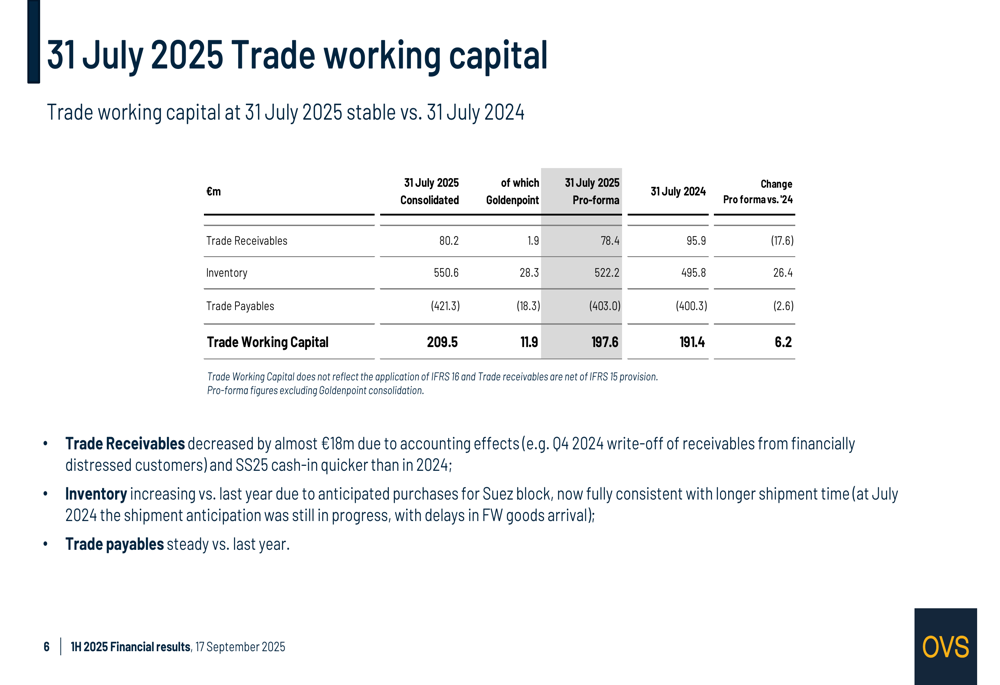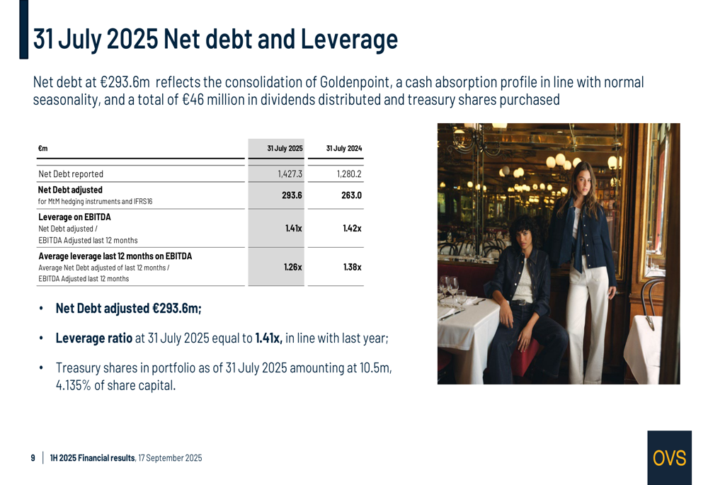 OVS’s net debt stood at €293.6 million as of July 31, 2025, with a leverage ratio of 1.41x, which the company noted was in line with the previous year. The debt position reflects the consolidation of Goldenpoint and approximately €46 million in dividends distributed and treasury shares purchased. As of the reporting date, OVS held 10.5 million treasury shares, representing 4.135% of its share capital.