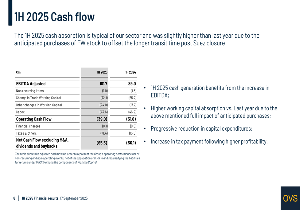 Cash flow for the first half of 2025 showed typical seasonal absorption, slightly higher than the previous year due to anticipated purchases of fall/winter stock to offset longer transit times following the Suez Canal closure. The company emphasized that its cash generation benefited from the increase in EBITDA and noted a progressive reduction in capital expenditures.