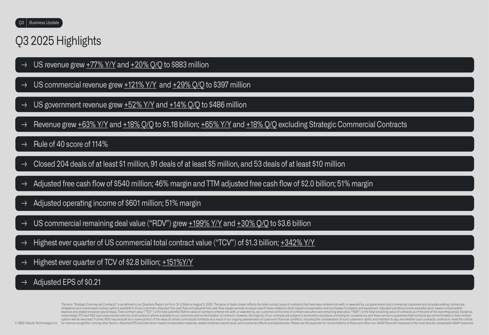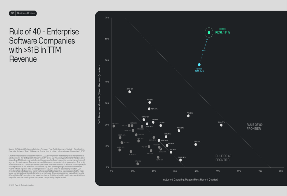 Palantir’s Q3 2025 results demonstrated broad-based strength across all key metrics, with total revenue growing 63% year-over-year to $1.18 billion. The company achieved a Rule of 40 score (combining revenue growth and adjusted operating margin) of 114%, significantly outperforming other enterprise software companies.