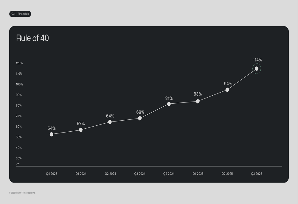 Palantir’s Rule of 40 score has shown consistent improvement over the past eight quarters, rising from 54% in Q4 2023 to 114% in Q3 2025, placing it among the elite performers in the software industry: