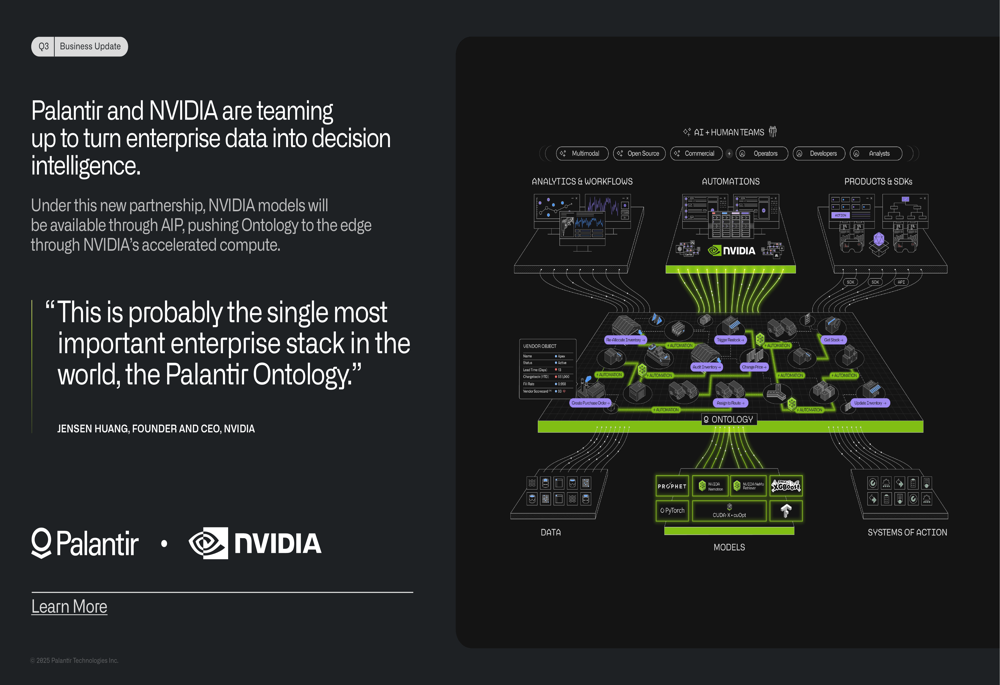 Palantir highlighted several strategic partnerships that position the company for continued growth. Most notably, its collaboration with NVIDIA aims to leverage enterprise data for decision intelligence, with NVIDIA’s CEO Jensen Huang describing Palantir’s Ontology as "probably the single most important enterprise stack in the world":