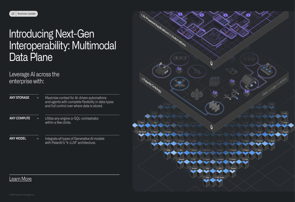 Additionally, Palantir introduced its Next-Gen Interoperability: Multimodal Data Plane, which enables AI integration across enterprise systems: