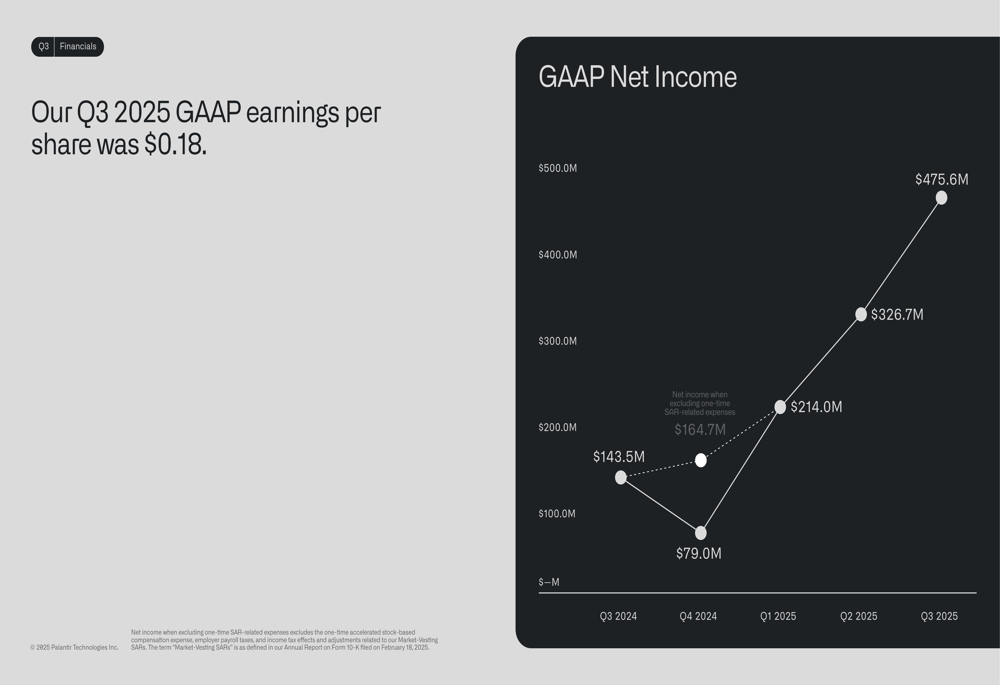 Palantir’s profitability metrics showed significant improvement in Q3 2025. GAAP net income reached $475.6 million, continuing a strong upward trajectory over the past five quarters:
