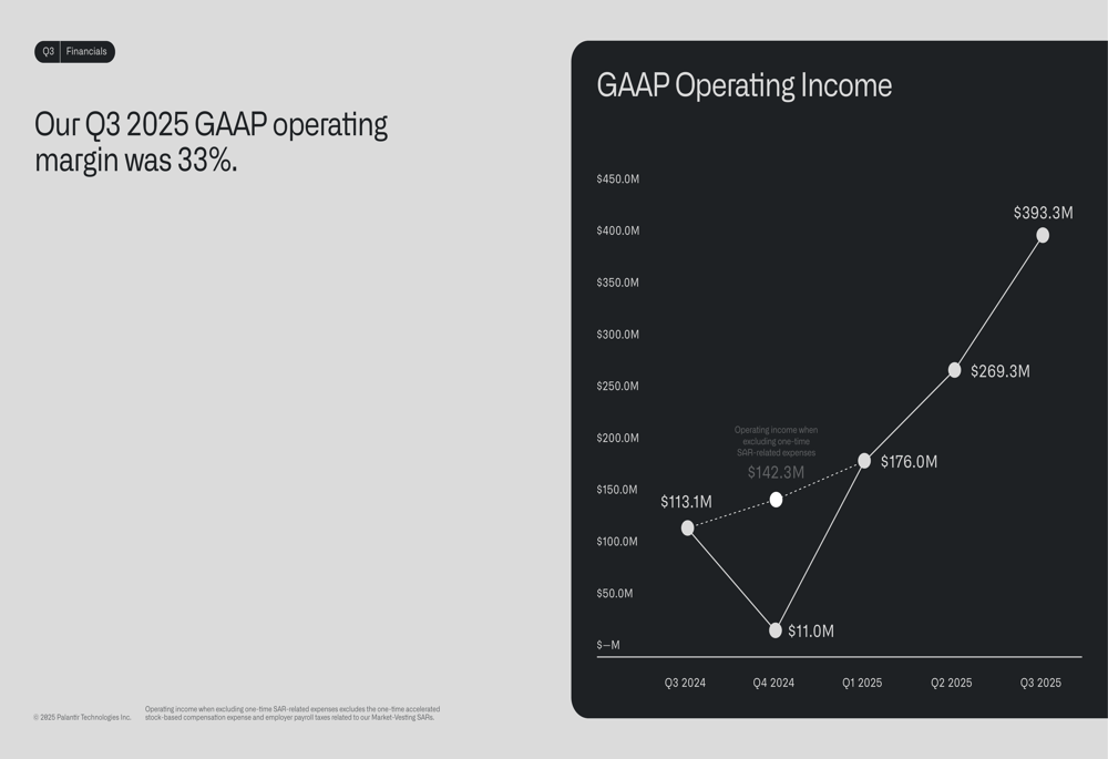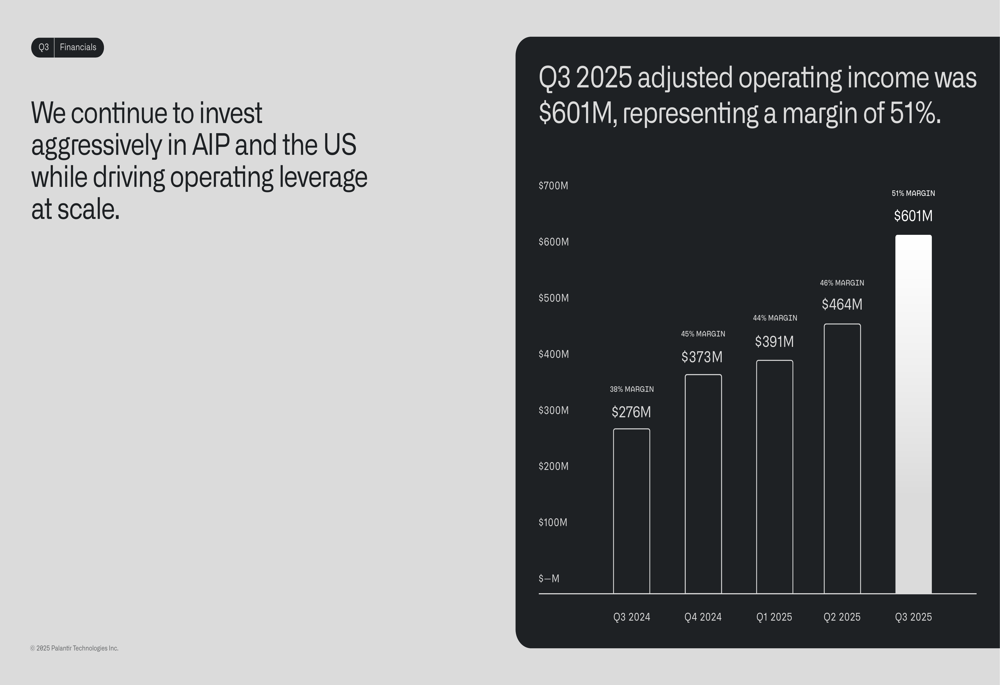 The company’s adjusted operating income reached $601 million with a record 51% margin, demonstrating Palantir’s ability to scale efficiently while investing in growth: