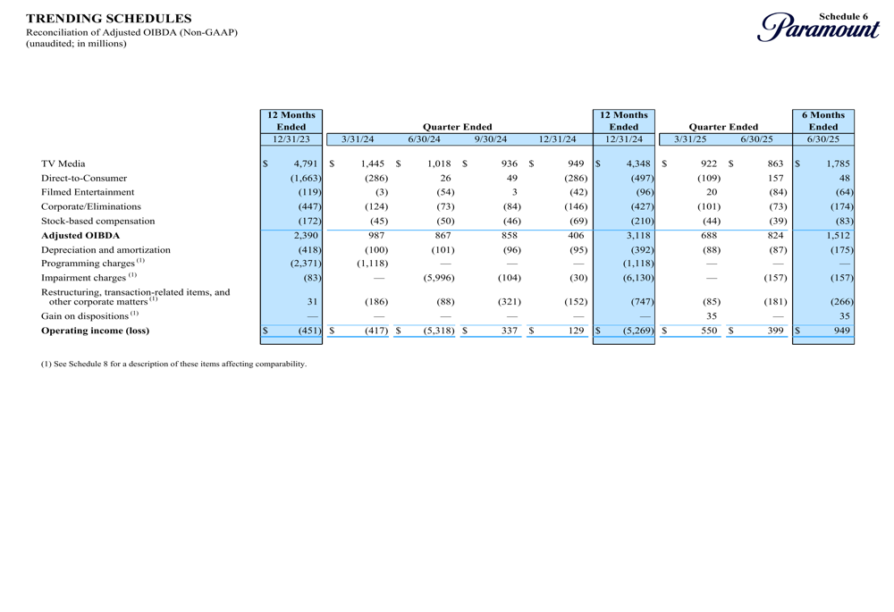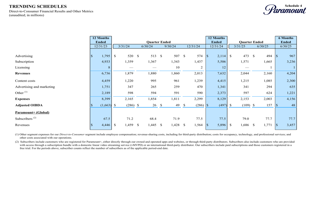 The Direct-to-Consumer (DTC) segment, which includes Paramount+, showed notable progress by achieving positive adjusted OIBDA of $48 million in Q2 2025. This milestone represents a significant turnaround for the streaming business, which has been a major investment focus for the company.