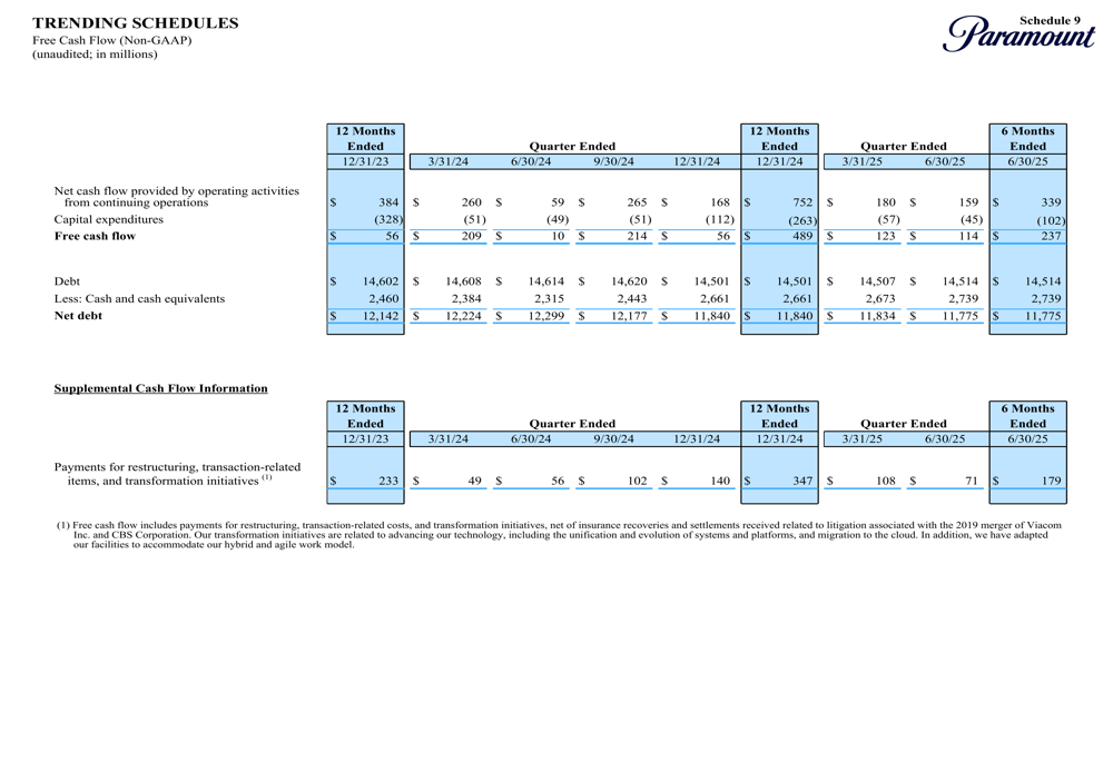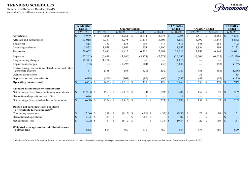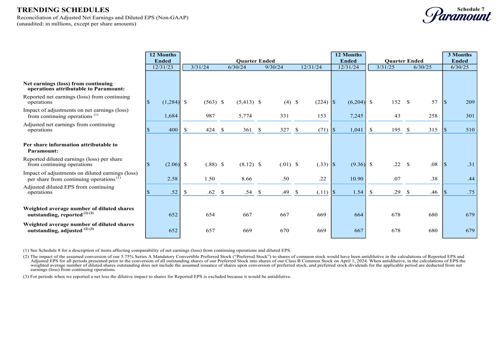 Adjusted net earnings from continuing operations attributable to Paramount reached $510 million for Q2 2025, significantly higher than reported figures due to various adjustments.