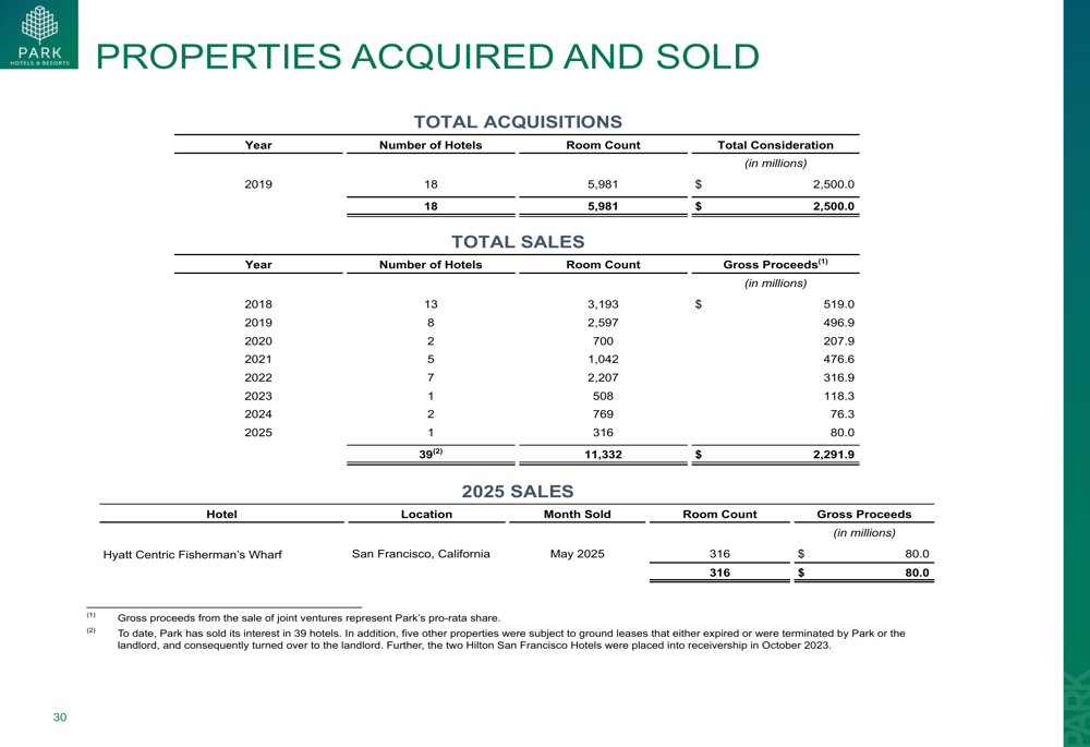 Park Hotels continues to execute its portfolio optimization strategy, focusing on its core properties while divesting non-core assets. The company has sold 39 properties since 2018 for a total consideration of approximately $2.3 billion, including the recent sale of Hotel at Fisherman’s Wharf in San Francisco (316 rooms) for $80 million in 2025.