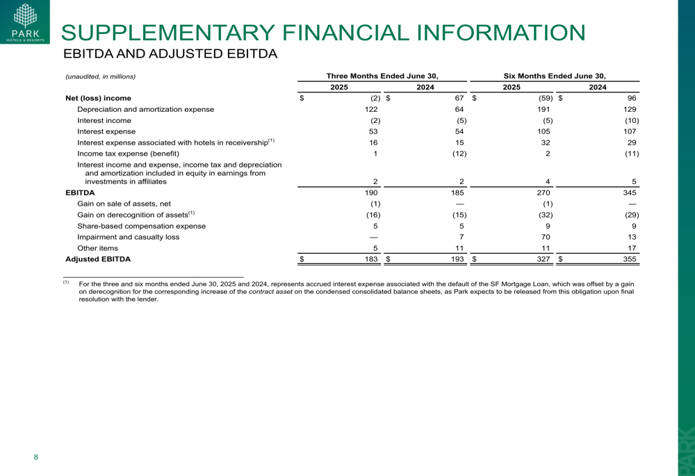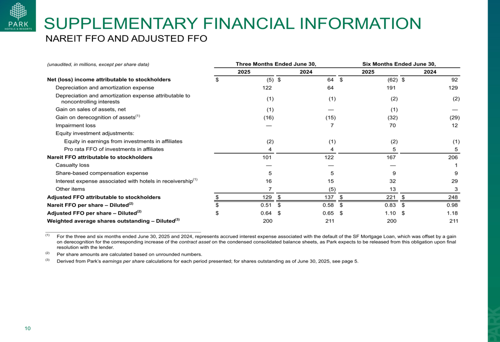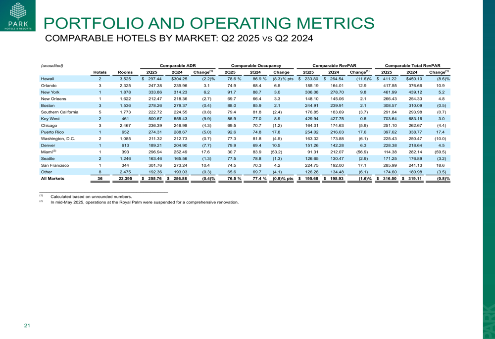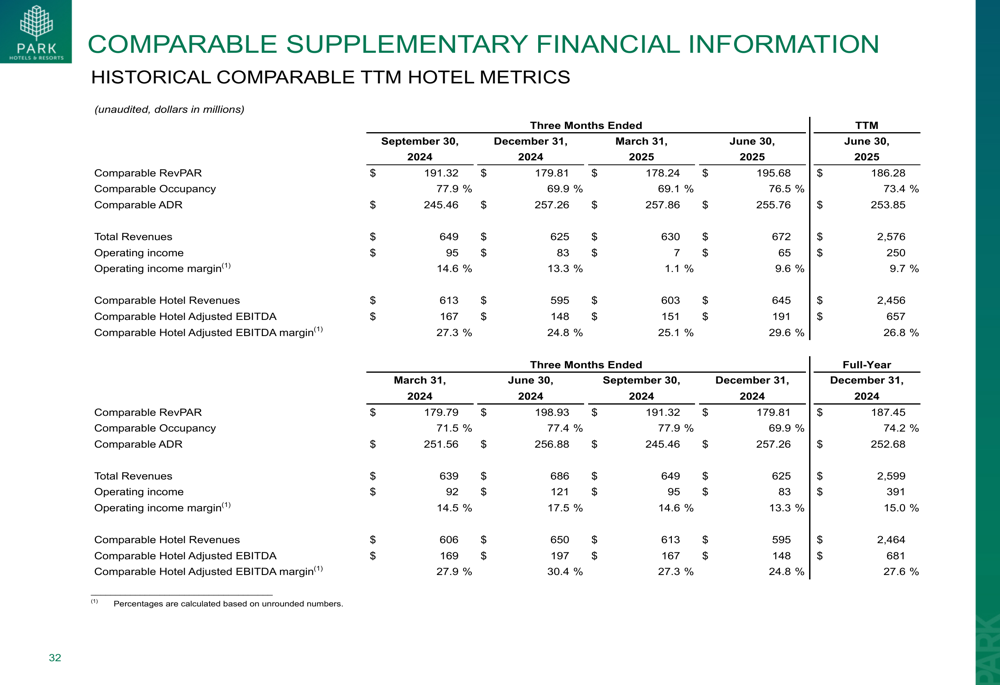 Park Hotels’ Adjusted EBITDA decreased to $183 million in Q2 2025 from $193 million in Q2 2024, while Comparable Hotel Adjusted EBITDA came in at $191 million compared to $197 million in the prior year period. The following table provides a detailed breakdown of these key metrics: